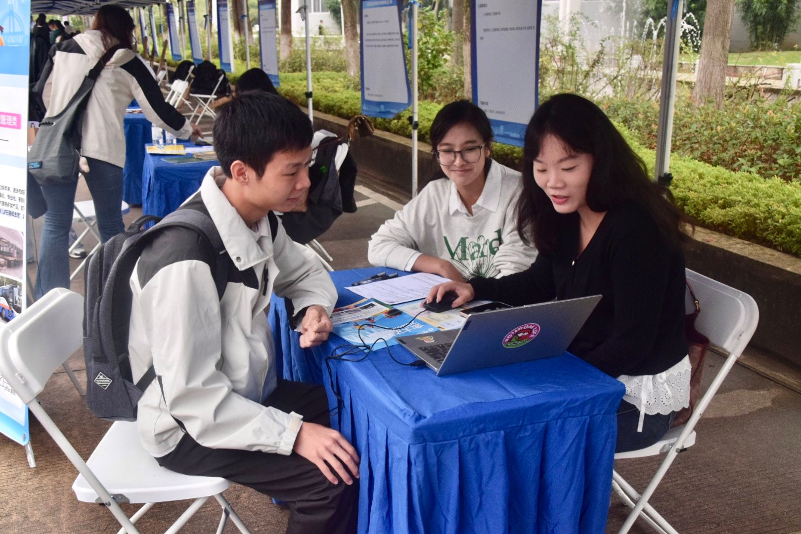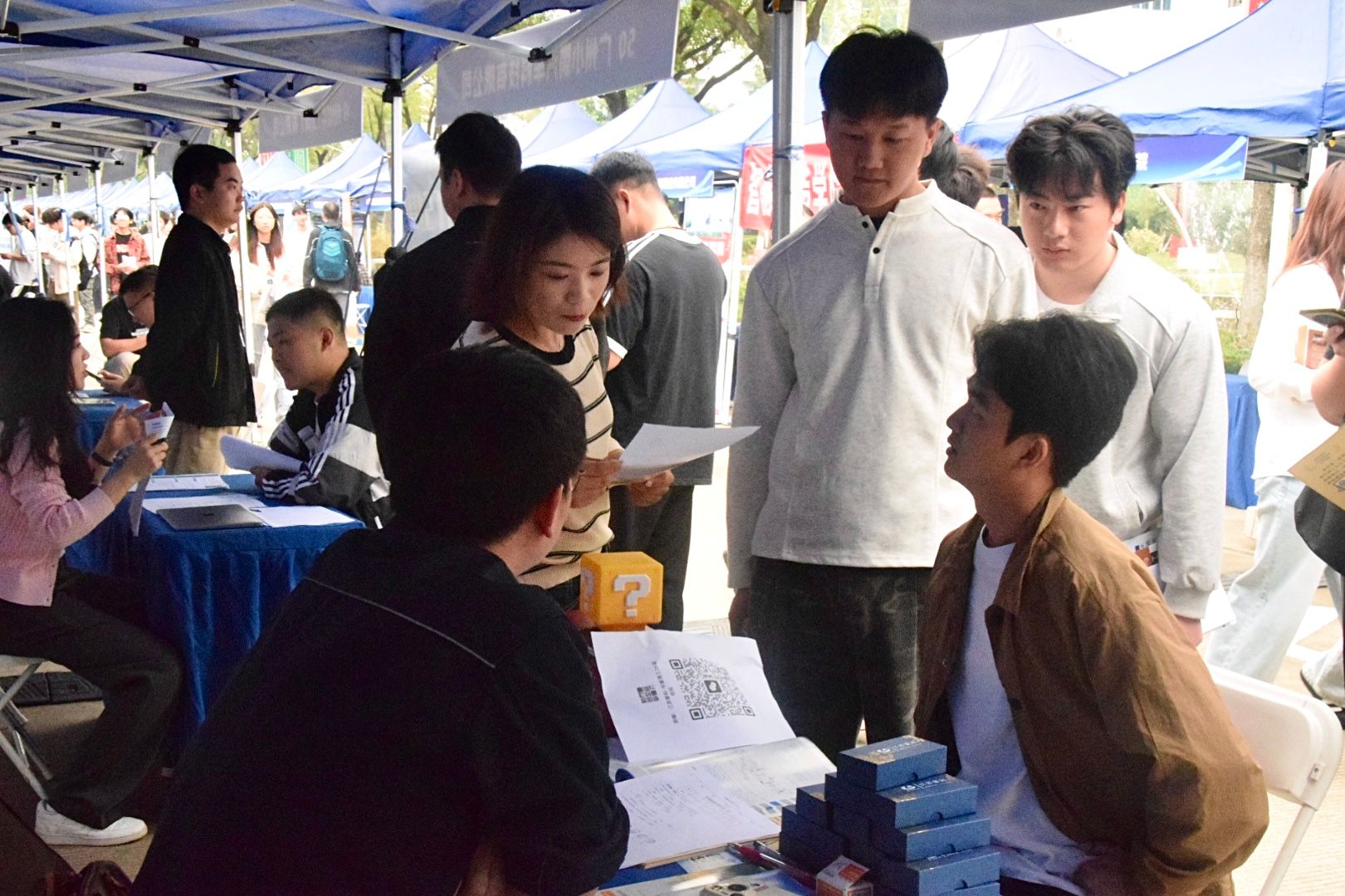 双选会现场气氛热烈,人流如织。企业代表早早布置好展位,热情迎接前来咨询的学生。“同学,你是什么专业?”话音未落,一份份精美的宣传资料已递到学生手中。热门企业展位前排起长龙,队伍蜿蜒曲折却秩序井然。为提升招聘效率,部分单位直接在醒目位置张贴下午宣讲会信息。学生们手持简历和企业资料,或驻足细读,或聚首讨论,纸页翻动声与交流声此起彼伏。