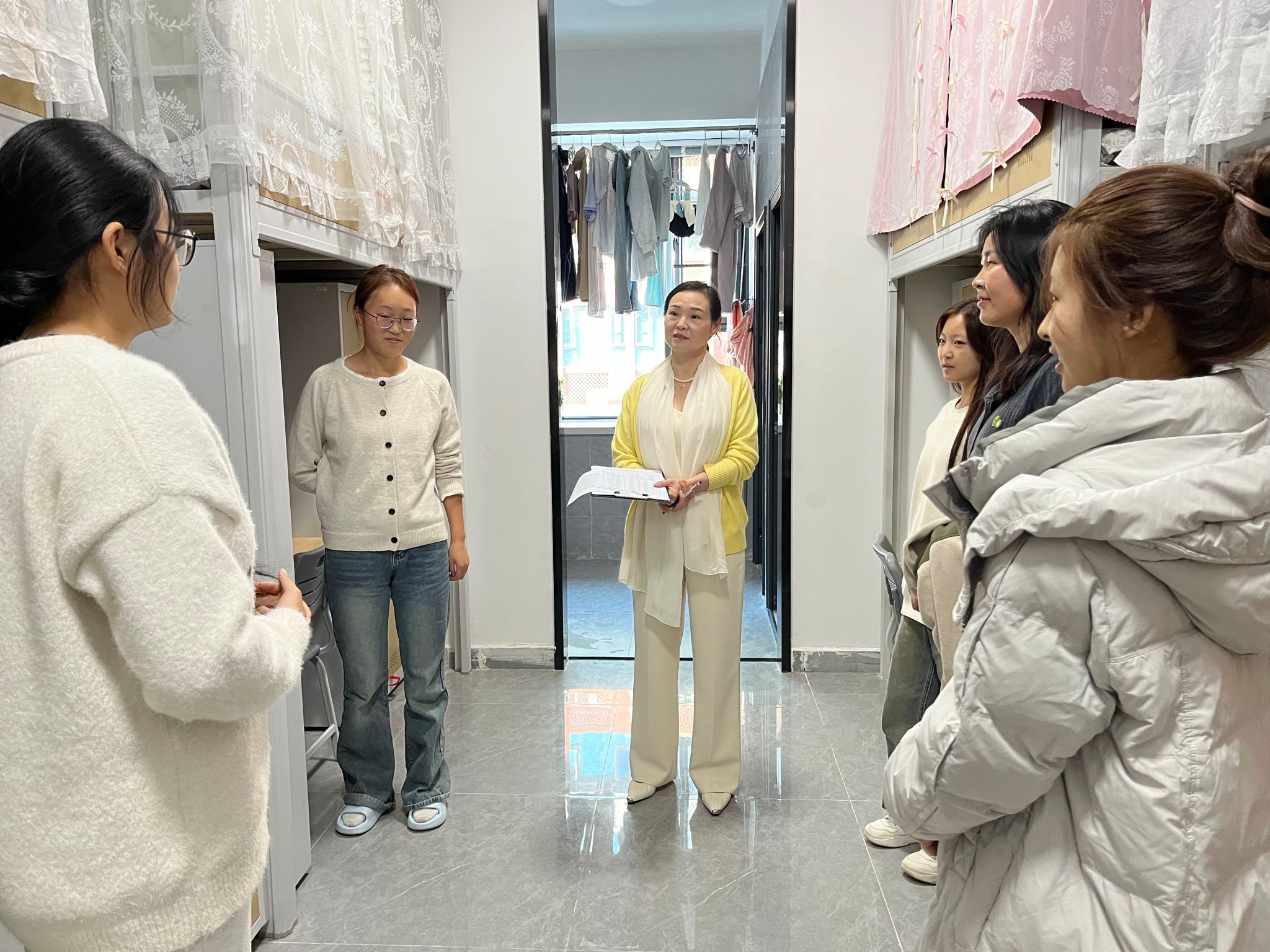 随后,在丁德智与校长助理赵杨、刘美云、李海燕的带领下,检查组对新生宿舍1—6栋进行拉网式走访,细致查看了学生在宿舍内的学习生活习惯养成、宿舍学习与文化氛围营造、宿舍环境卫生及安全隐患排查等情况,并重点关注了新生辅导员日常巡查宿舍工作的落实效果。丁德智表示,宿舍是第二课堂,既要查问题,更要树标杆,要引导学生营造安全、文明、和谐、进取的宿舍环境,使之成为培育优良学风的重要阵地。