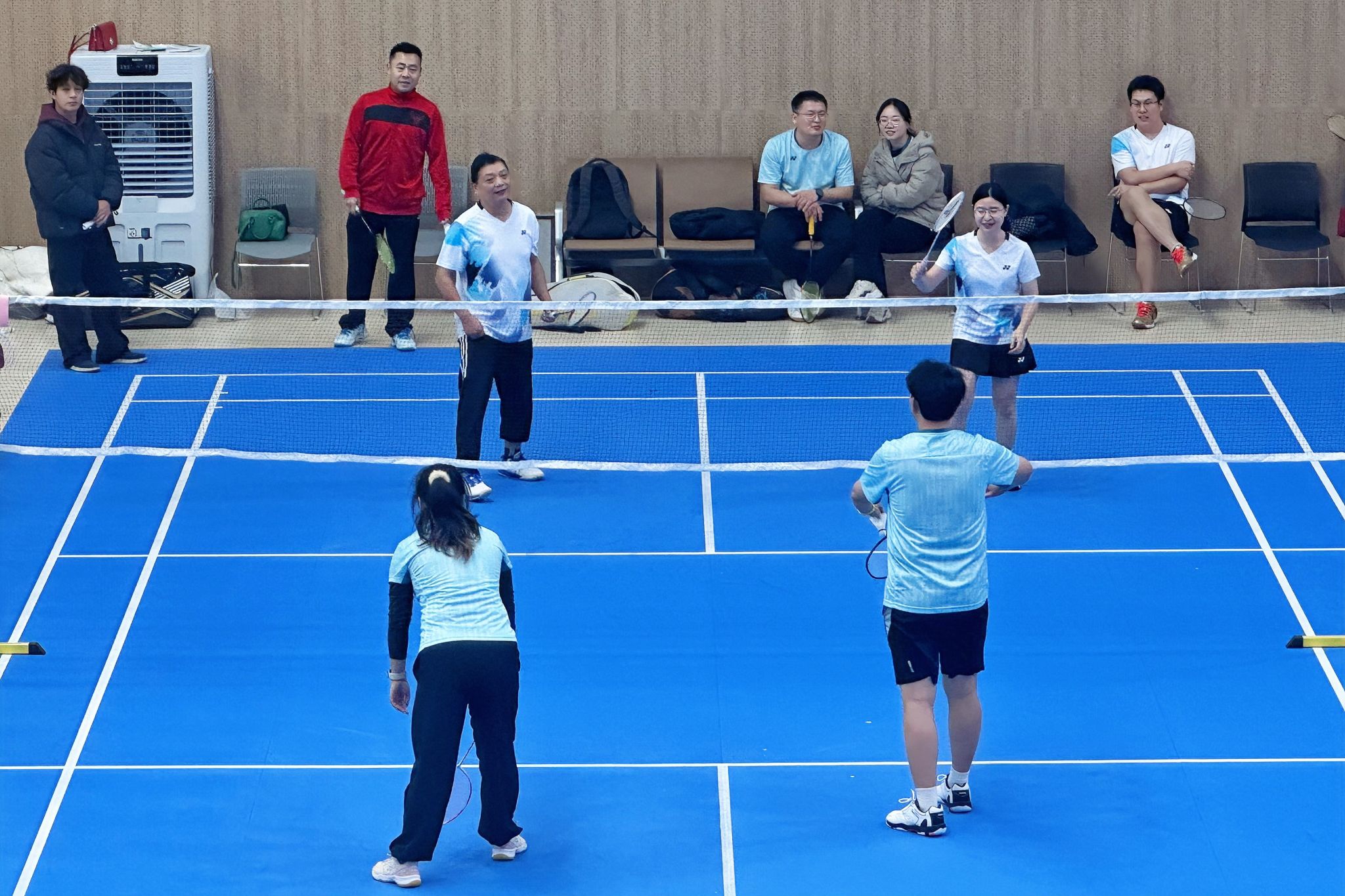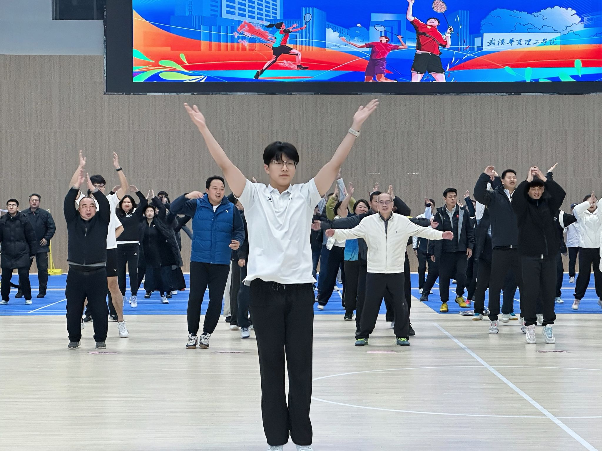 在体育学院黎明老师的带领下,全体参赛教职工进行了赛前热身。本次比赛采用羽毛球“无与伦比”赛制,各队每场比赛需派出五组队员,对阵双方中率先获得20分后暂停比赛并同步替换下一组队员,任意一方累计得分先达100分的队伍获胜,该赛制既考验选手个人技术,也检验团队整体实力。