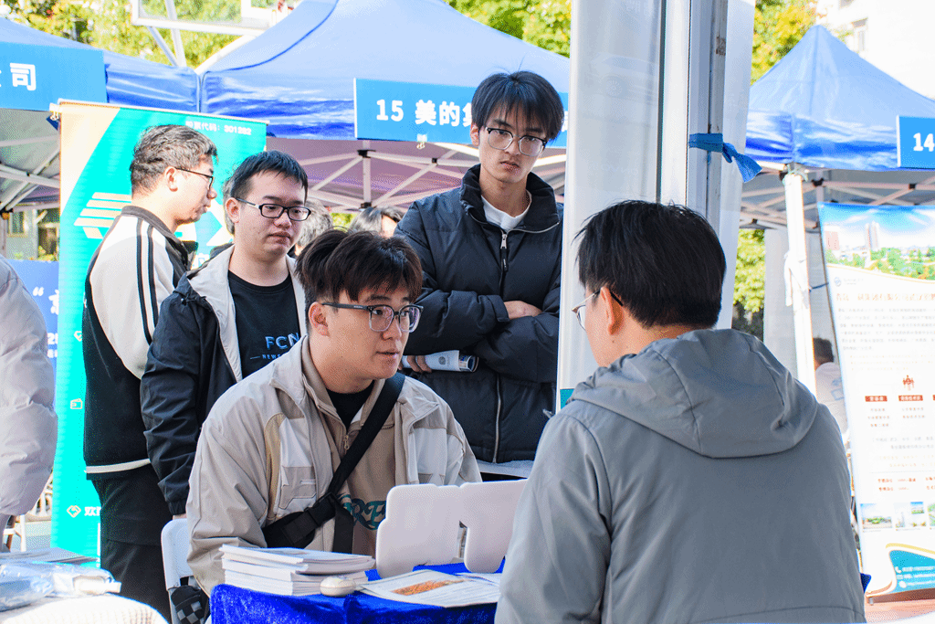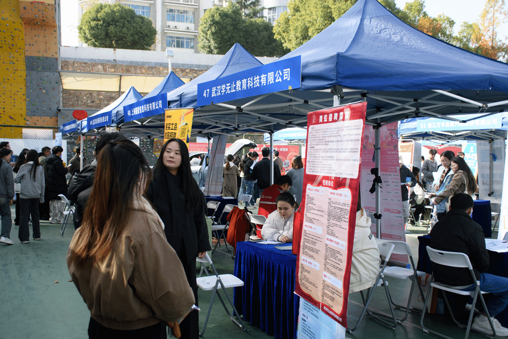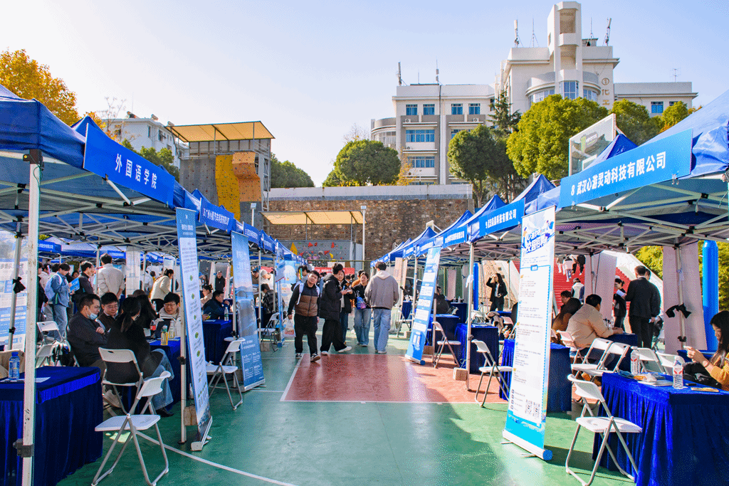 11月27日下午,由武汉市蔡甸区人力资源和社会保障局与我校联合主办的2026届毕业生秋季双选会(第二场)在桃园食堂对面篮球场举行。本次双选会由学生就业创业指导服务中心承办,以“华夏英才,职等你来”为主题,汇聚80余家优质企业,提供岗位5000余个,覆盖机械、信息、教育、金融、制药、美术设计等全部专业方向,吸引逾千名毕业生踊跃参与。