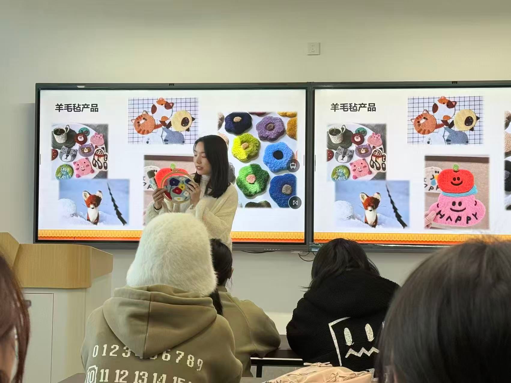 活动伊始,刘雪颖为同学们系统梳理了羊毛毡技艺的千年脉络。她从古代游牧民族“擀毡成毯”的实用工艺出发,生动讲述了这一古老技艺如何跨越时空,演变为当今备受青睐的艺术创作形式。她指出,羊毛毡以其温暖质朴的质感与无限自由的创作空间,为现代人提供了一种回归本真、安顿心灵的独特方式。随后,刘老师细致演示了戳针的使用技巧、羊毛的特性以及色彩搭配的原则,为同学们的创作实践奠定了坚实基础。