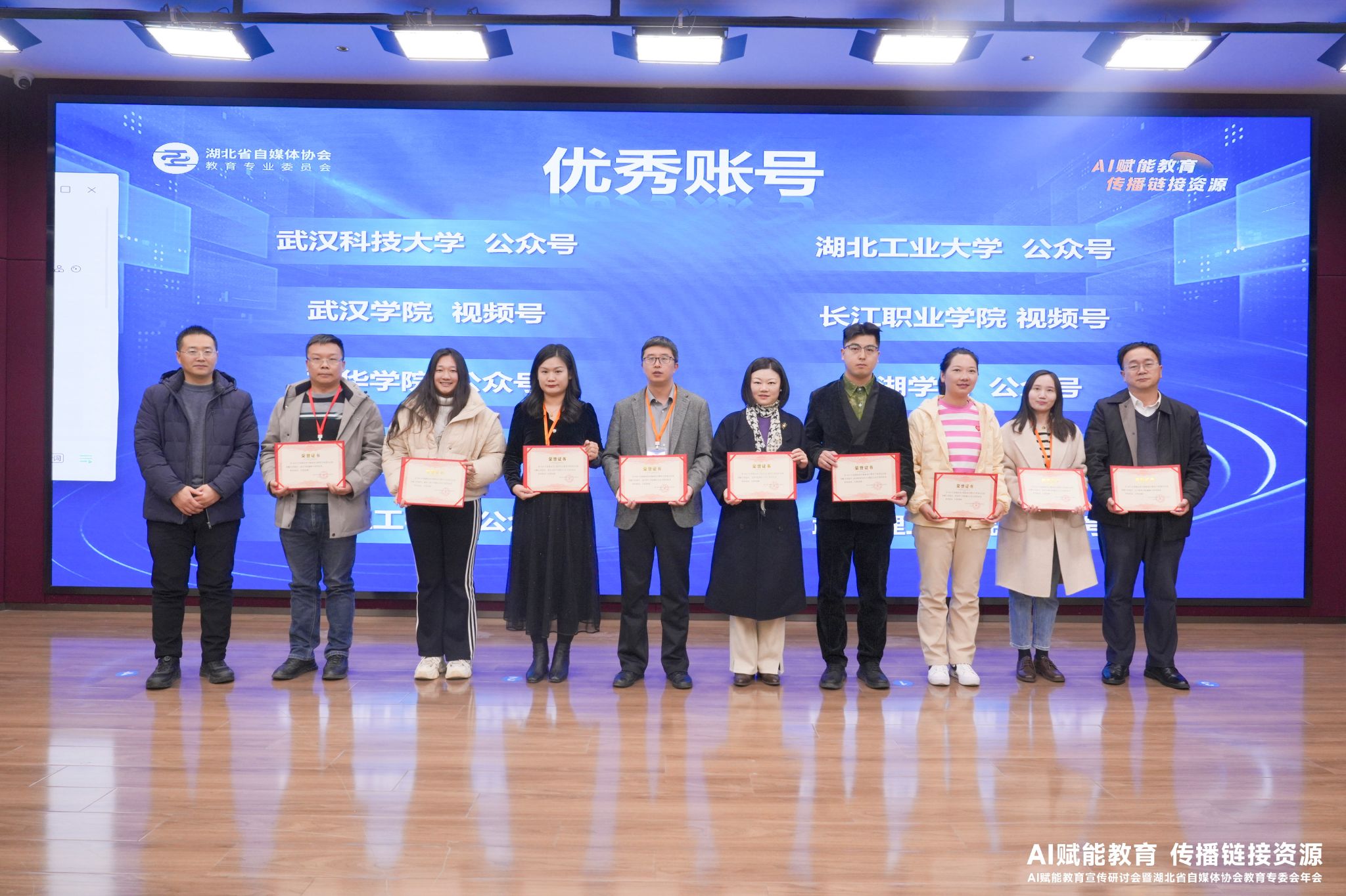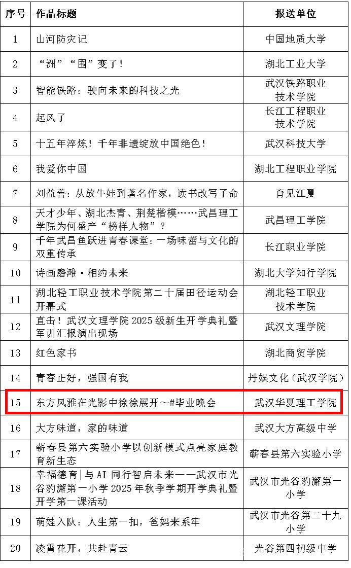 12月6日,AI赋能教育宣传研讨会暨湖北省自媒体协会教育专委会年会在华中师范大学举办。会议对年度优秀教育自媒体账号与作品进行了表彰。我校官方微信公众号获评“优秀账号”,短视频作品《东方风雅在光影中徐徐展开#毕业晚会》荣获“优秀作品”奖。
