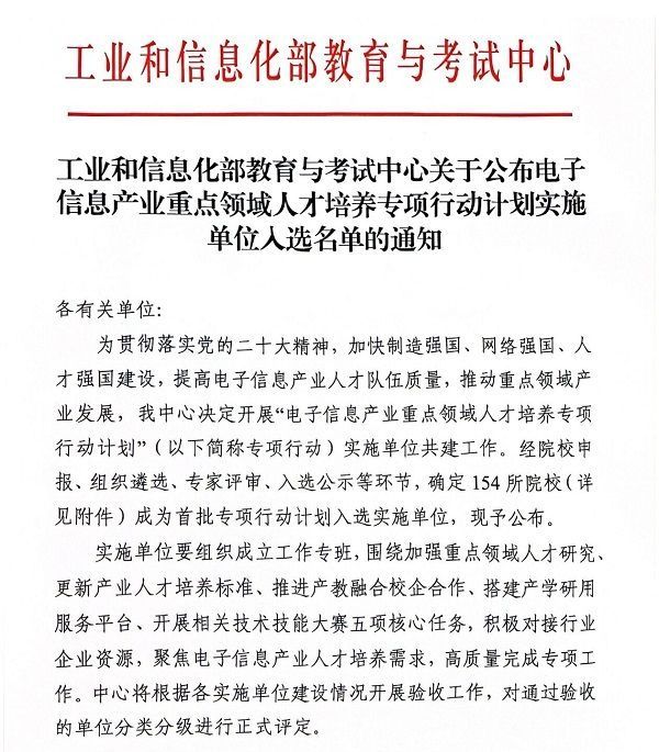 近日,工业和信息化部教育与考试中心公布了电子信息产业重点领域人才培养专项行动计划实施单位入选名单。我校获批首批本科院校组产教融合示范基地培育项目实施单位,这将大力推动电子信息相关专业建设,为学校应用型人才培养提供更高的产教融合平台。