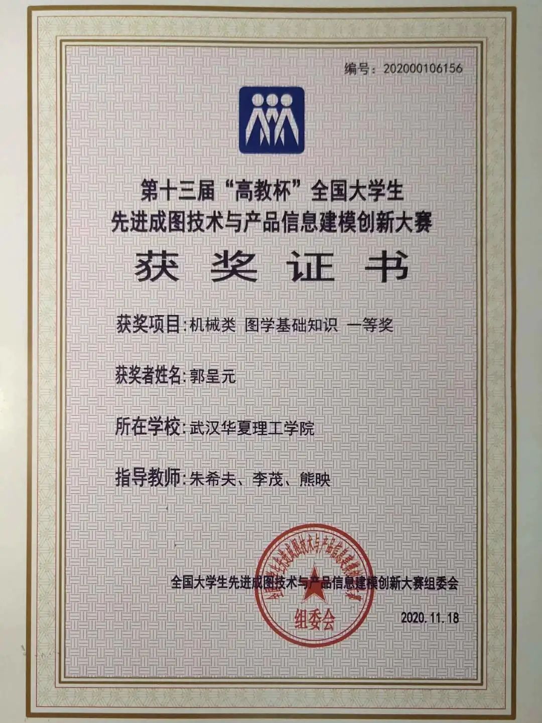 第十三届“高教杯”全国大学生先进成图技术与产品信息建模创新大赛机械类建模二等奖、机械类图学基础知识一等奖