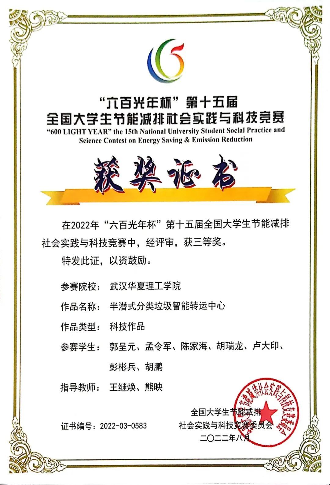“六百光年杯”第十五届全国大学生节能减排社会实践与科技竞赛国家三等奖