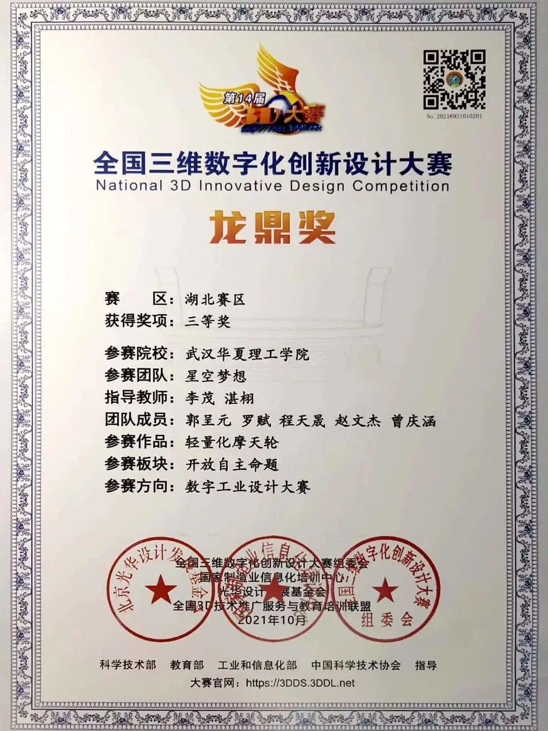 全国三维数字化创新设计大赛14周年精英联赛龙鼎奖特等奖两项、二等奖一项